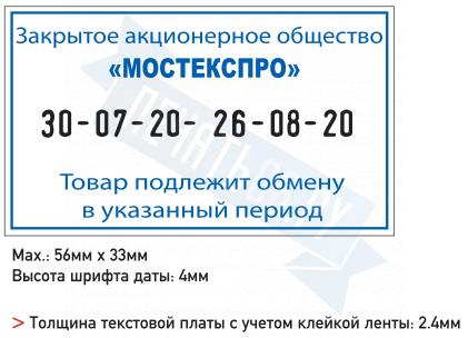 Поле: 56 х 33 мм, высота даты: 4 мм. Корпус: металл, пластик.Со встроенной окрашенной штемпельной подушкой синего цвета.